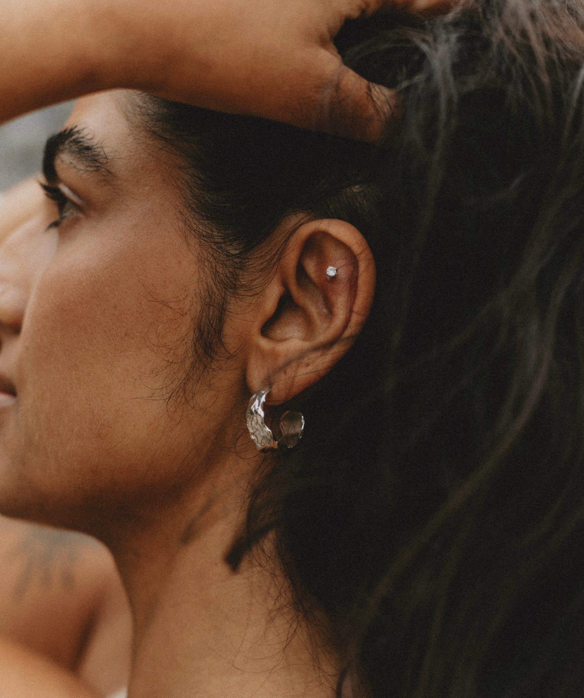 Handforged magma hoops. The metal has an organic texture to pick up light, just like the movement of water.