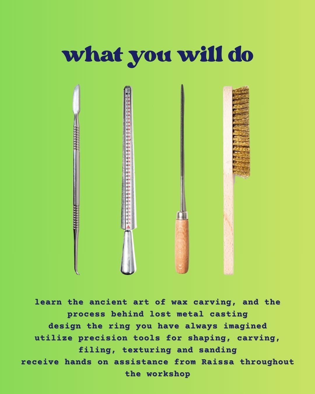 Learn the ancient art of wax carving, and the process behind lost metal casting design the ring you have always imagined utilize precision tools for shaping, carving, filing, texturing and sanding receive hands on assistance from Raissa throughout the workshop. Each participant receives 12 grams of silver. Gold available for an upgrade.